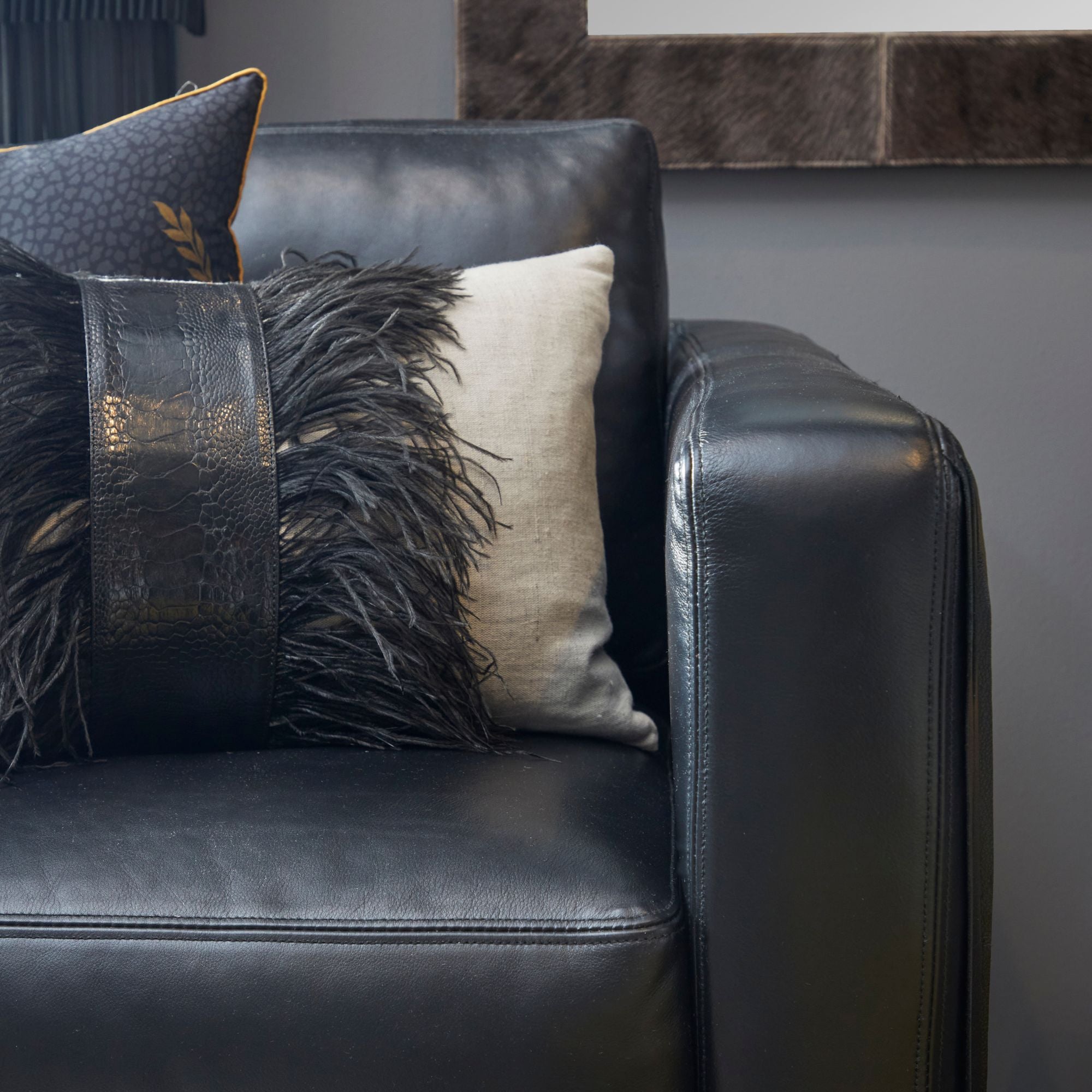 Ostrich Fluff Pouf Ottoman - Charcoal Leather / Black Feather