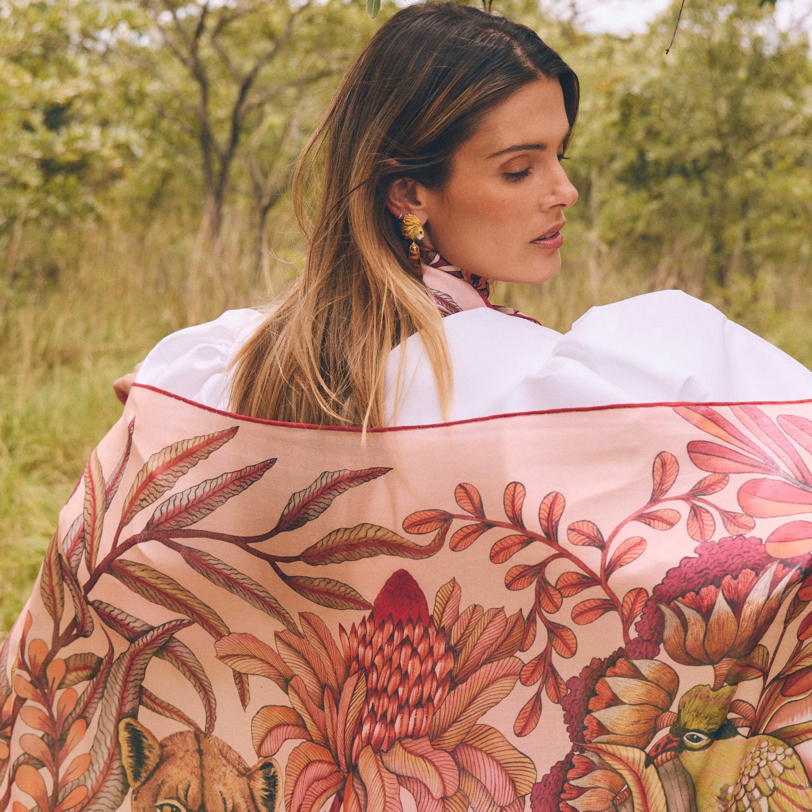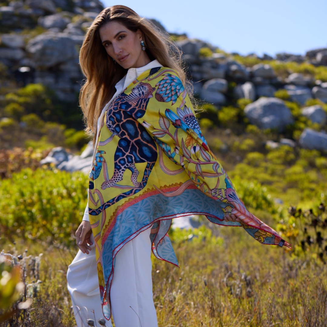 Inspired by the sweeping landscapes of South Africa, the Protea Plains Safari Wrap features a lyrical interpretation of the iconic protea in soft, painterly tones. Crafted from a luxurious modal-wool blend, this generously scaled wrap offers an elegant drape with lightweight warmth. Finished with delicate hand-rolled edges, it transitions effortlessly from travel companion to statement accessory—timeless, tactile, and quietly expressive.