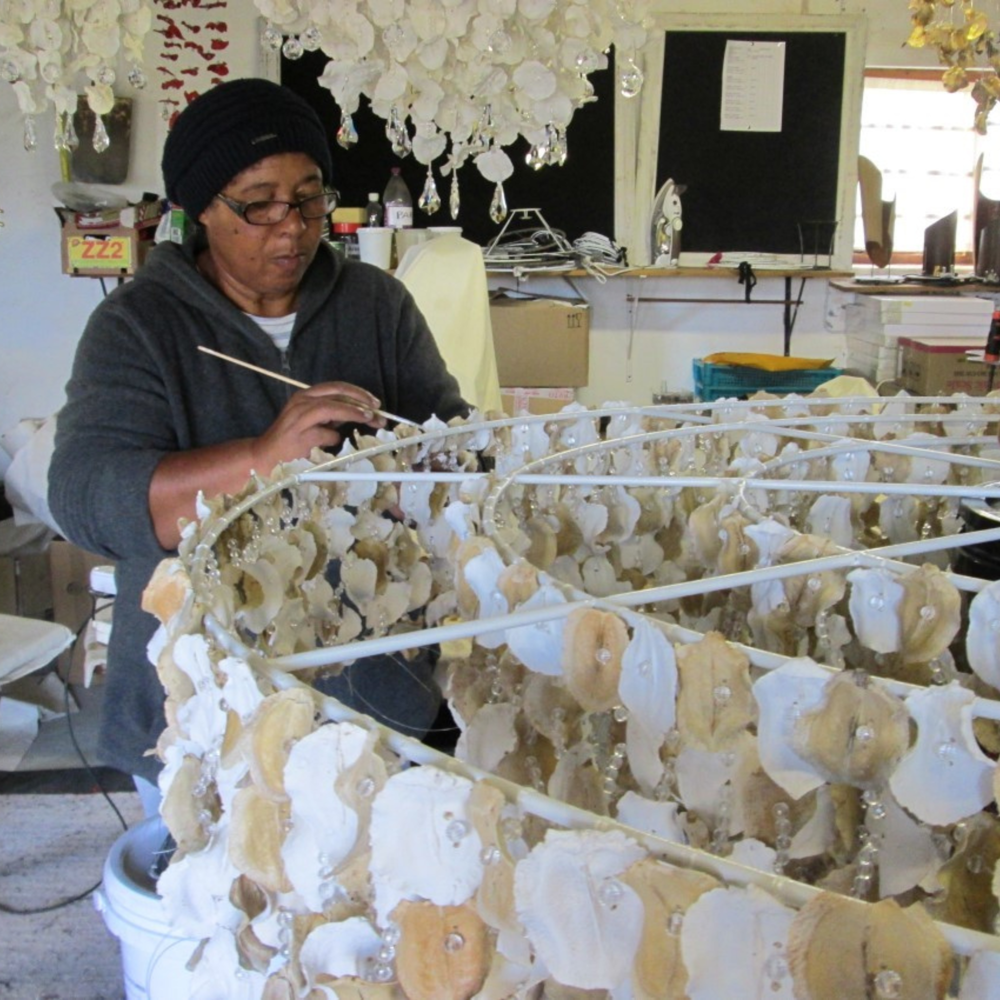 The African Queen Studio specializes in creating unique high quality handmade chandeliers, jacaranda pod framed mirrors, and other décor items using natural material, which are embellished with beads, crystals and other interesting pieces.