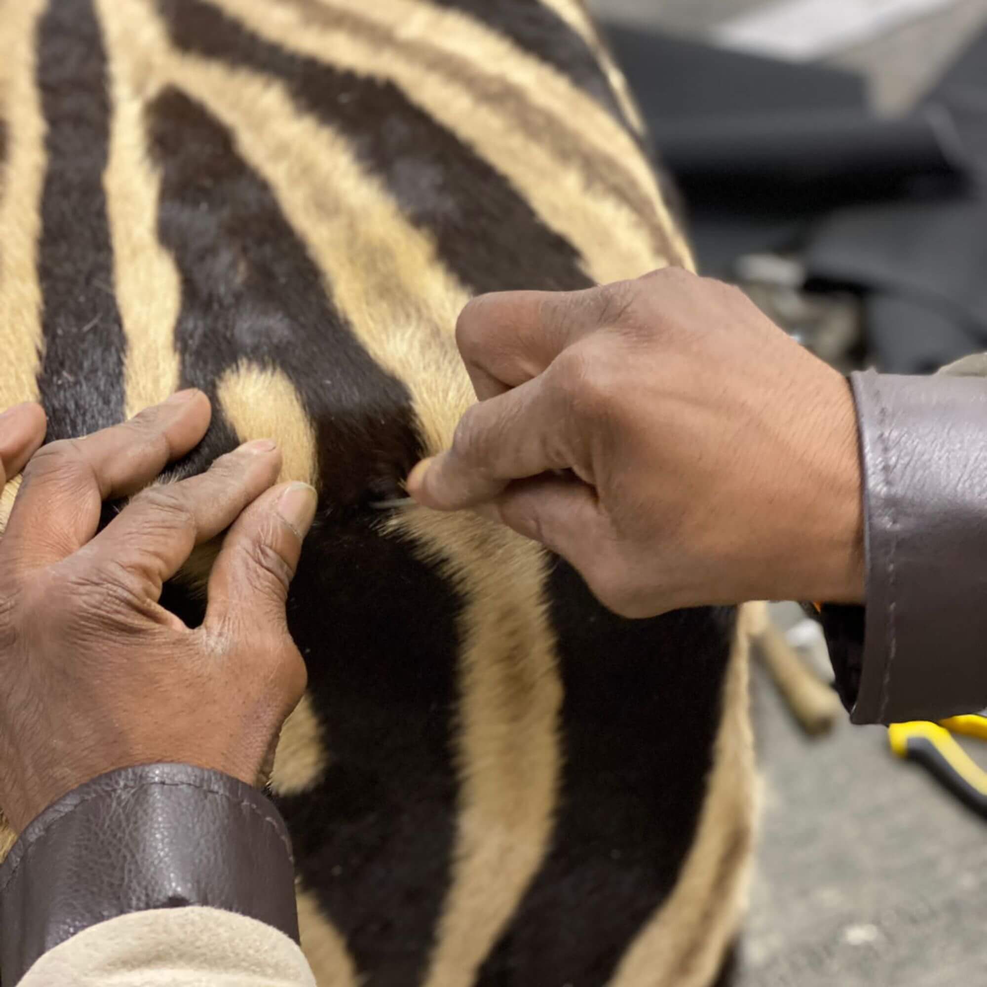 Decorative and functional, our ottoman is constructed with sustainably sourced Burchell's Zebra hide. Complemented with a double border of nail heads.