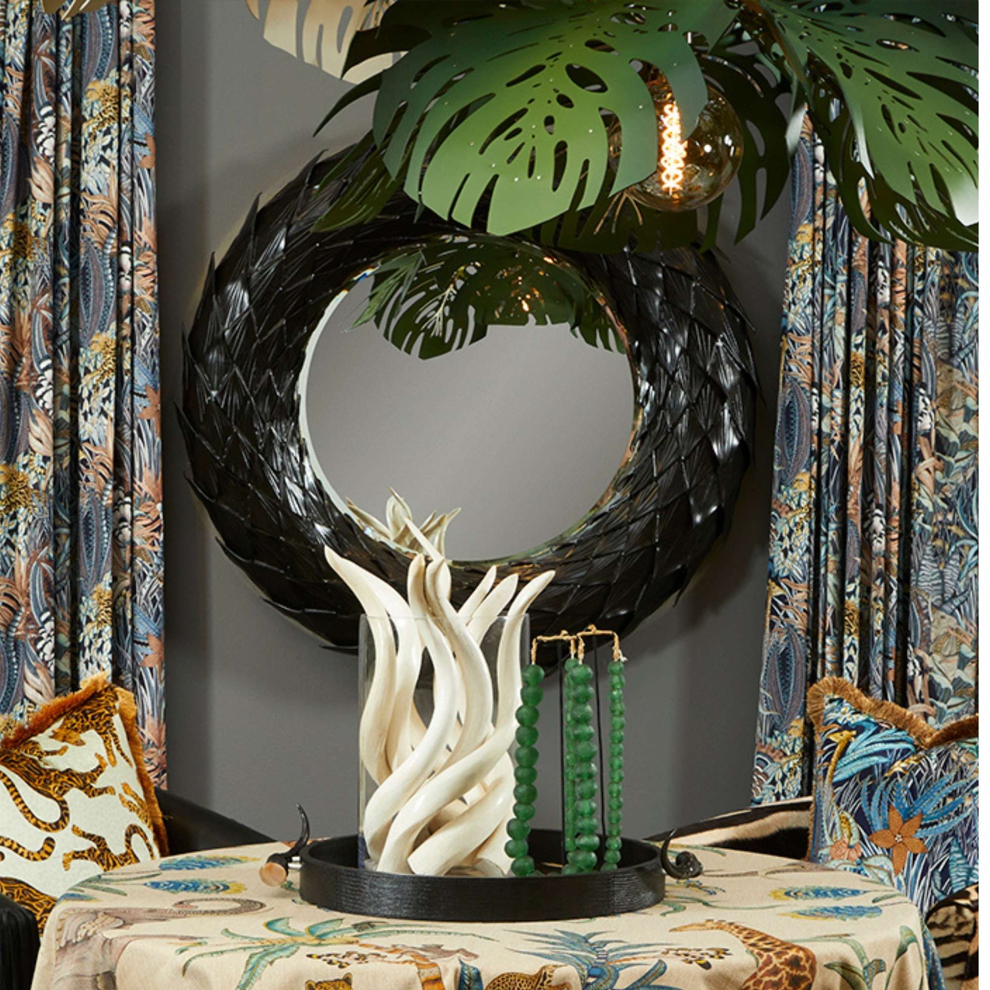 A one-of-a-kind statement piece that embodies the spirit of bespoke design. This custom Shaggy Swivel Chair pairs Ardmore’s Safari Spot Velvet in Midnight—a richly textured fabric that evokes the untamed beauty of the African landscape—with hand-cut leather fringe in a specially dyed hue to match.
